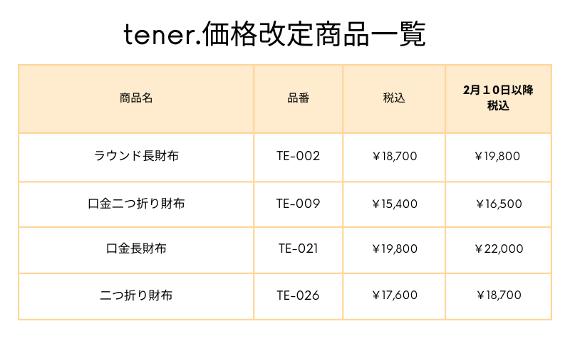 昨今、原材料価格の高騰が続いております。従来の価格を維持することが困難な状況となりました。誠に遺憾ではございますがtener./テネルの商品の一部を価格改定することになりました。お客様におかれましては、諸事情ご賢察の上ご理解いただけますと幸いです。