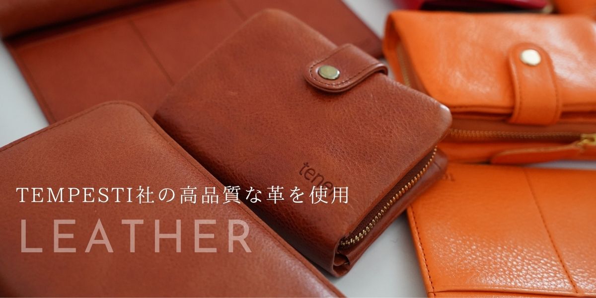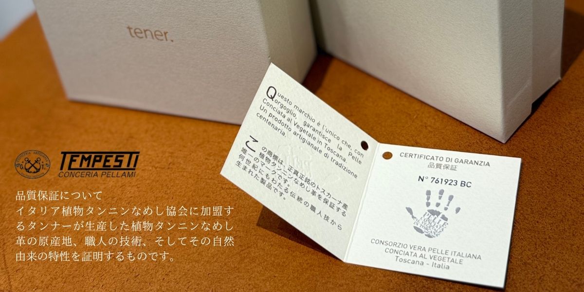 選ばれた最高級素材、100%植物タンニン仕上げの革は、水質や土壌の違いから日本では出せない色合いが出せます。TEMPESTI社の鞣し工程にはいつくもの作業が必要な伝統的な製法にこだわり、型崩れしにくく丈夫で染料の吸収が良く、発色が良い魅力ある素晴らしい革です。